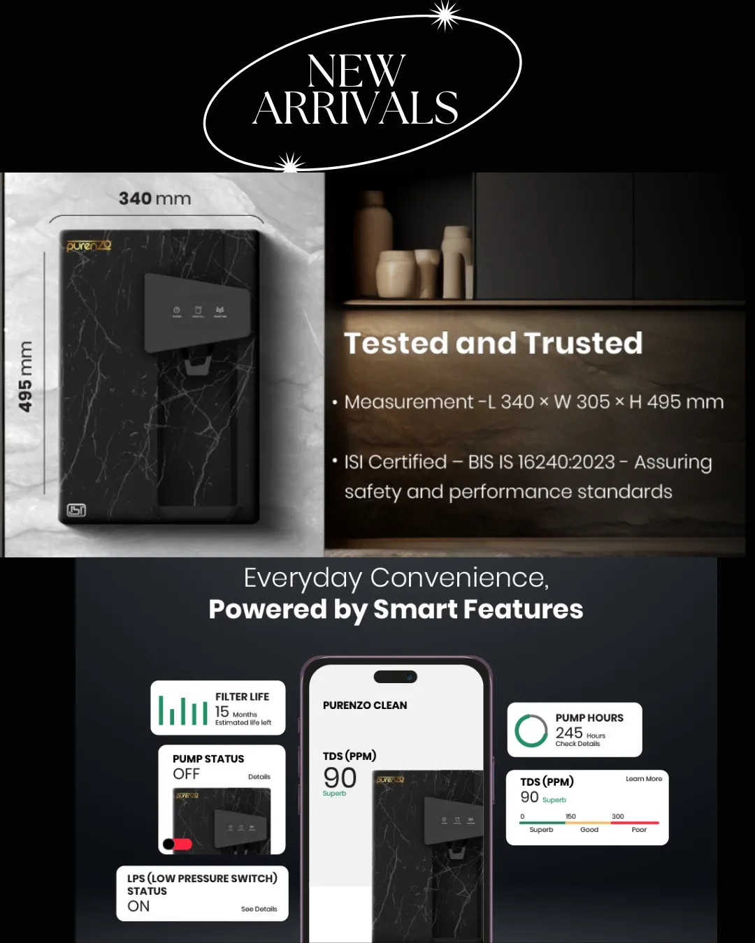 Displays Pump Status, Filter Life (e.g., 15 months estimated life left), LPS (Low Pressure Switch) Status, and TDS (PPM) levels